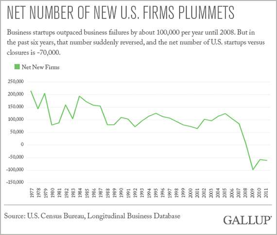The problem, of course, is that declining net new firms means fewer Microsoft's, Google's ect. in the future. Anyone in commerce will tell you that small business is suffering greatly.